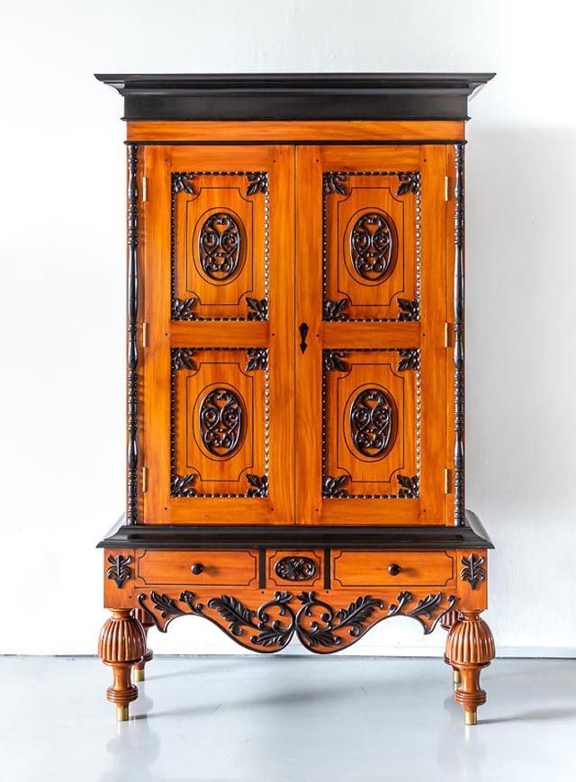 Especially in Dutch colonial furniture, ebony was often used together with other types of wood like satinwood or mahogany. The Indian cabinet-makers used these timbers with great affect as can be seen on this piece, with the cabinet being almost an exhibition piece, showing off their skills and local timbers. Extremely popular in the 19th century these items of furniture have carried on their popularity into the 21st century. Sought after by collectors and designers this is a very rare and exceptional quality cabinet.