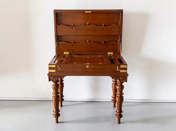 Shop our collection of Antique Campaign Furniture from the colonial era in India. Campaign or “knock down” furniture was portable military furniture used by British officers when they set out for a campaign in India. However, because campaign furniture was extremely versatile, it also appealed to homeowners who appreciated its elegance, strength and ease of storage.