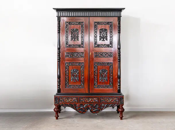 Late 19th centuryA beautiful Dutch colonial cupboard in satinwood with a deep flaring cornice with an ebony moulded edge above a short ebony frieze. The double doors are constructed with fielded panels mounted at centre with a design in ebony, surrounded by ebony lining and a moulded ebony edge with ebony fleur-de-lis in the four corners. The doors, which are flanked by ebony pilasters, open to an interior with two shelves. The lower section of the cabinet has a moulded ebony edge and two drawers in the frieze with ebony pulls. The scalloped apron is decorated with ebony foliage. The legs are in a traditional Dutch style with a bulbous top, tapering, with a ring and ending in a peg foot.