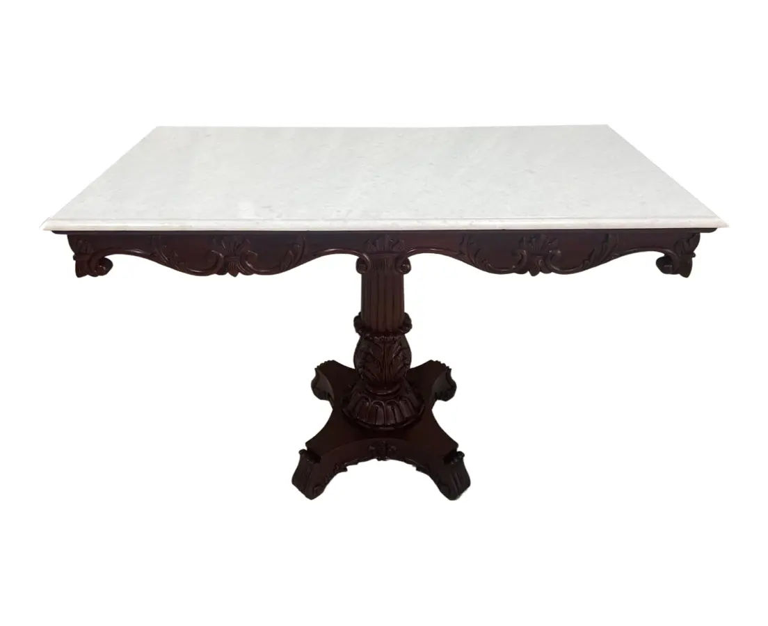 A British Colonial Anglo-Indian dining table in mahogany with a new marble top. The apron with serpentine foliate carved pattern. The base has a solid central pillar that is fluted ending in a floral motif. This pillar rests on a quatrefoil platform with hollowed sides terminating in four scrolled carved feet.