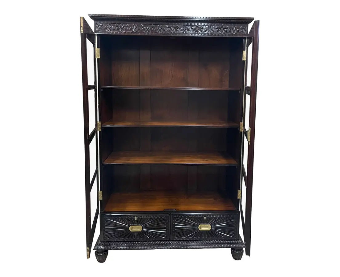 A British Colonial bookcase, expertly crafted from rosewood. The upper section features a flat cornice adorned with a gadrooned edge, gracefully complemented by an intricately carved foliate frieze. Behind the twin glass doors, the interior offers four robust rosewood shelves, providing ample display and storage space. Below, two lockable drawers showcase striking sunburst motifs and retain their original recessed brass pulls, set above a further gadrooned molding. The entire piece stands elegantly on finely tapered and fluted bun feet, exemplifying refined colonial craftsmanship.